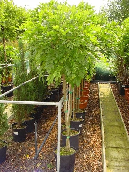 Wisteria sinensis ‘Alba’ is een blauwe regen met witte bloemen.