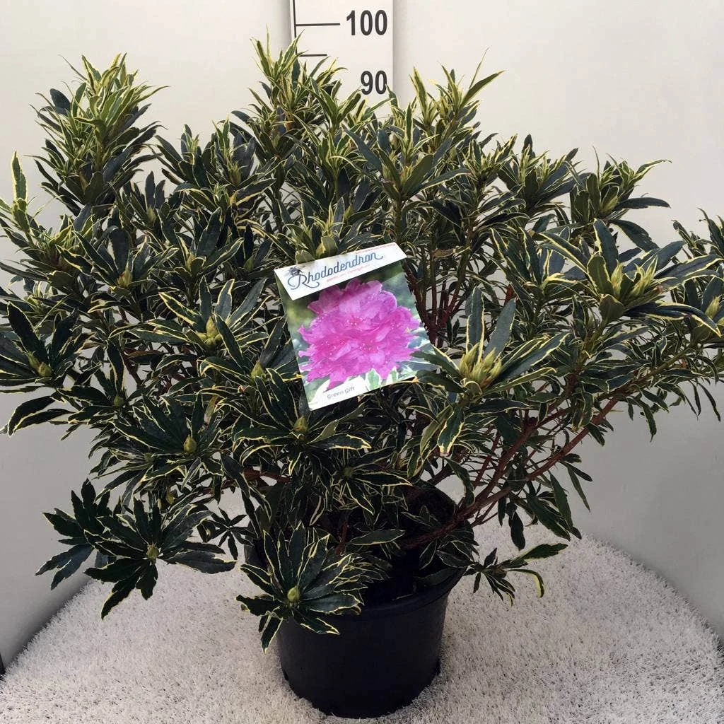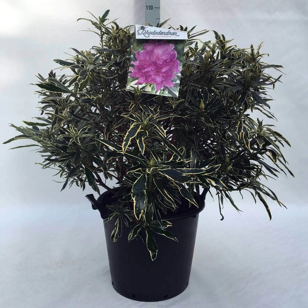 Rhododendron ponticum ‘Variegatum’ heeft witbonte bladeren hierdoor is deze Rhododendron een opvallende verschijning in de tuin.